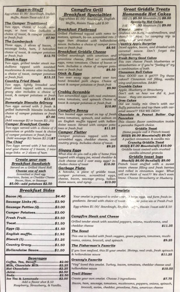 “ This place is so popular Sunday mornings so we had to wait about 30 minutes. We got our drinks right away but then had to wait again for a server which we expected. Our orders came quickly and were good except my potatoes could have been a little softer. Our server did a great job and was friendly and efficient. I like the place but feel it would look better with a paint job and more attention to the Campfire theme. But I will continue to go back! ”